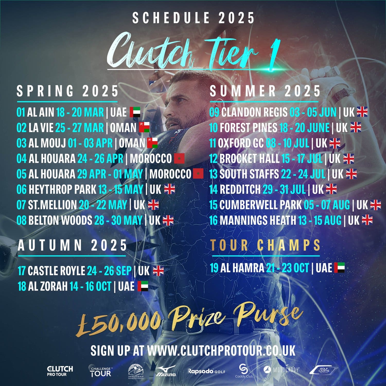 In 2025, both Tom Gandy and Taylor Paul are competing on the Clutch Pro Tour. The tour features a packed schedule across top courses across the UK as well as in the UAE,Morocco and, Oman. With a total prize fund of £1.8 million, the tour offers a vital platform for both Tom and Taylor to showcase their talents across the 2025 season. Players on tour compete for three full Challenge Tour cards, 30 Challenge Tour invites, exemptions to the DP World Tour Q-School Second Stage.